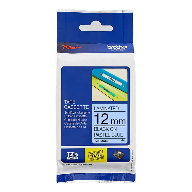 Perfect for everyday applications and to organize your home and office with the Brother TZe-MQ531 Laminated Tape Black on Pastel Blue.