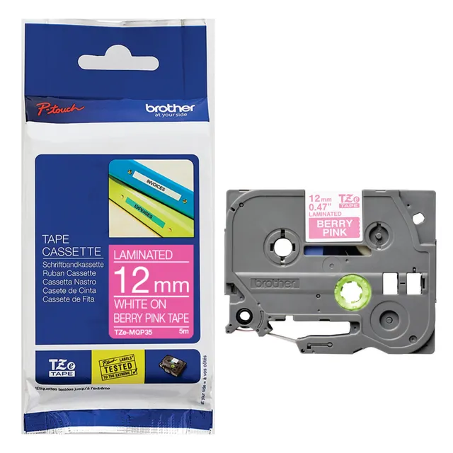 Perfect for everyday applications and to organize your home and office with the Brother TZe-MQP35 Laminated Tape White on Berry Pink.