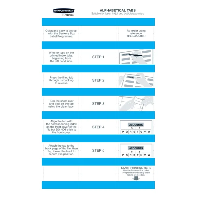 Bankers Box Alpha Adhesive Tabs 55mm – Blue 144 Labels keeps your alphabetical filing clean and consistent, with self-adhesive tabs that give files a clear blue index for quick scanning. Colour options in this range: Assorted, Blue, Green, Red, White.