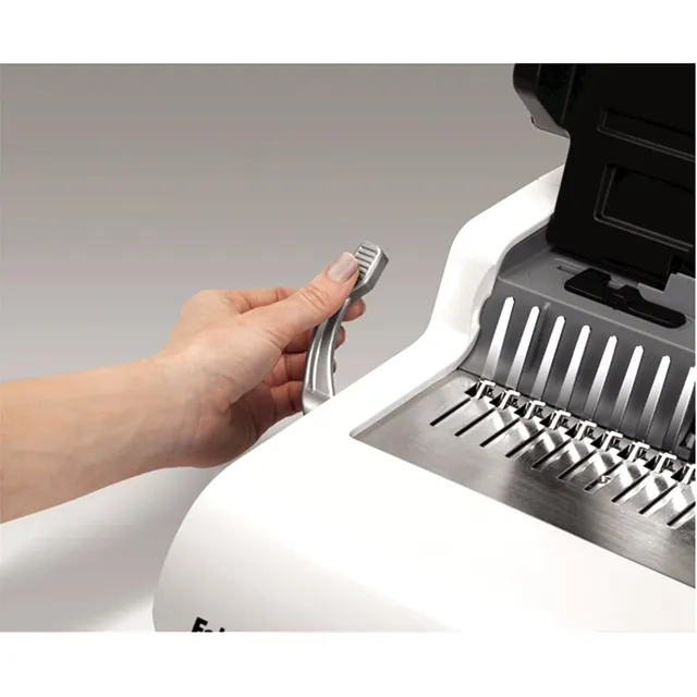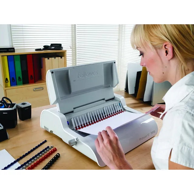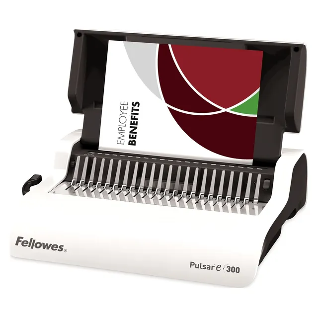 Fellowes Pulsar-E Electric Comb Binding Machine delivers fast, neat comb binding for everyday office documents. One-touch electric punching handles up to 20 sheets, while the binder finishes booklets up to 300 sheets for a clean, professional look.