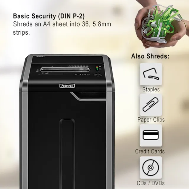 Fellowes Powershred 325i Strip Cut P2 Paper Shredder is a heavy-duty office shredder designed for busy departments, delivering continuous-duty performance, ultra-quiet operation and jam-proof reliability for high-volume everyday shredding.